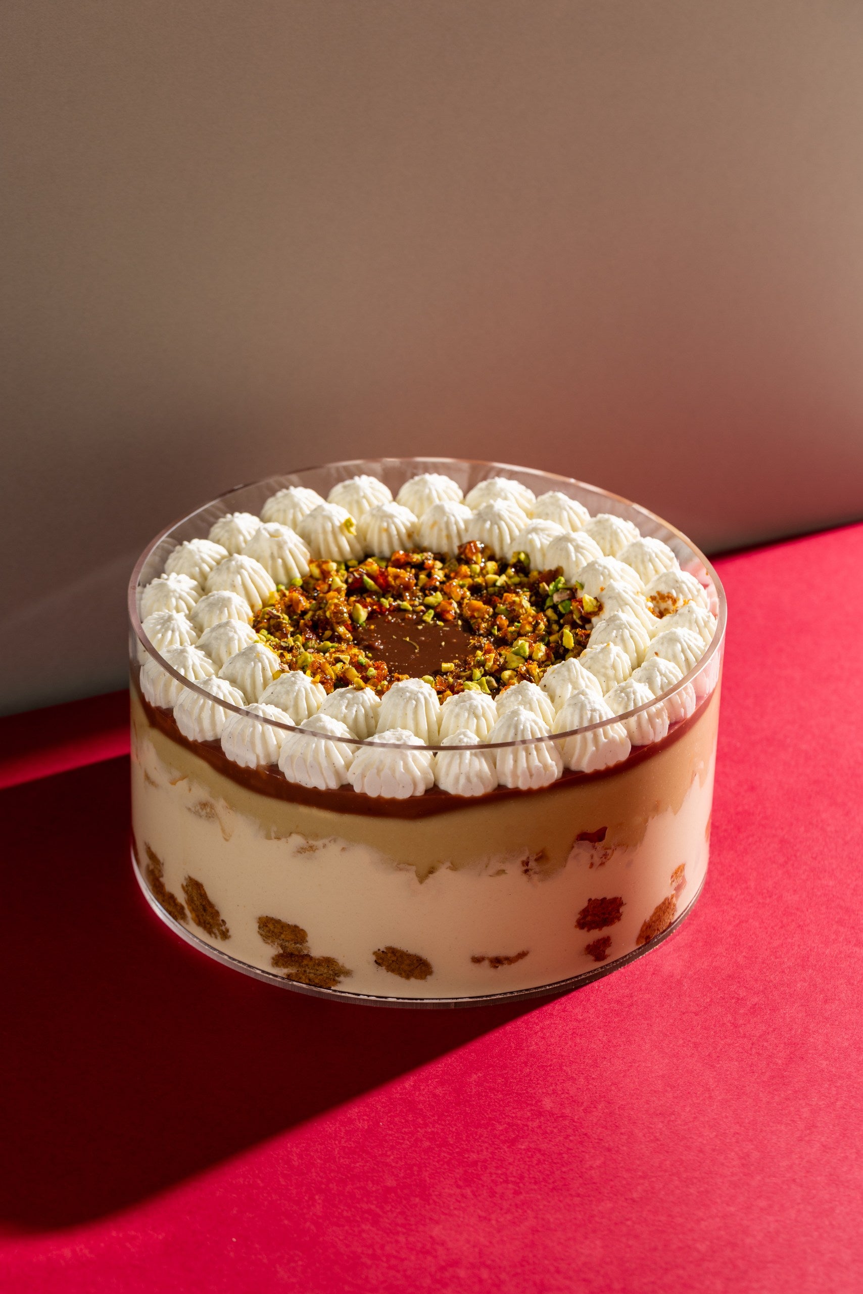 Classic savoiardi biscuits, pistachio cremeux, gianduja & chocolate ganache, and candied nuts